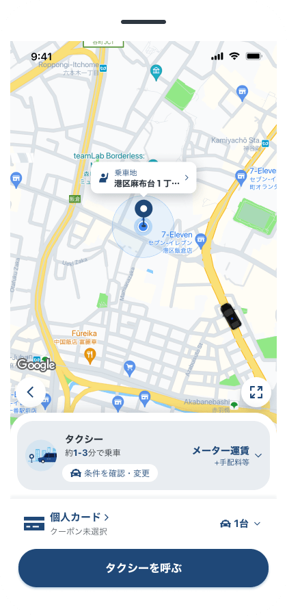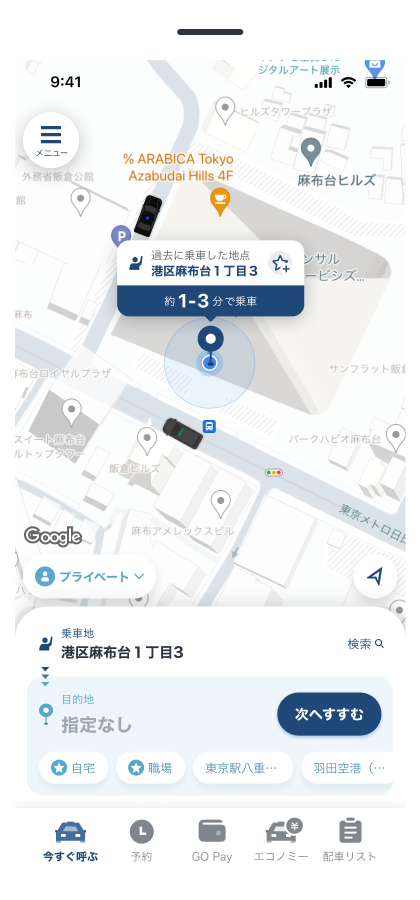 タクシーが到着したら通知が届きます。あらかじめ降車位置を指定していれば乗車時に行き先を伝える必要もありません。