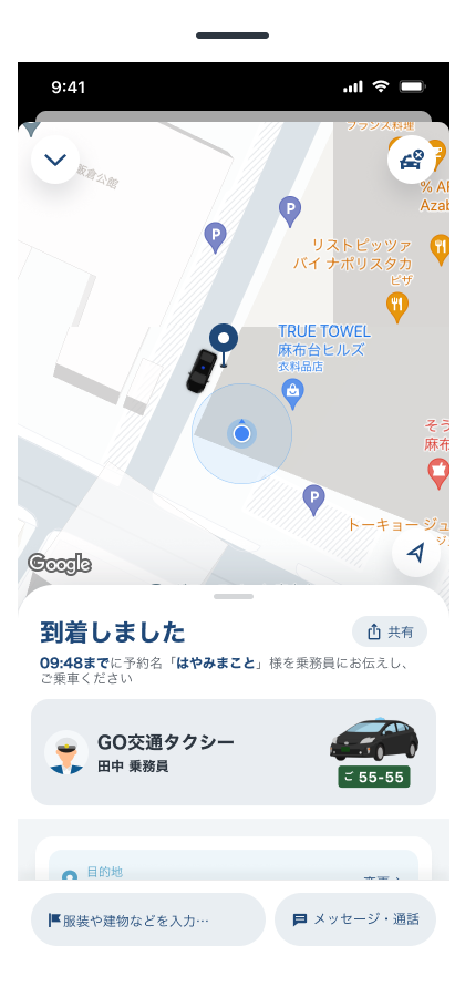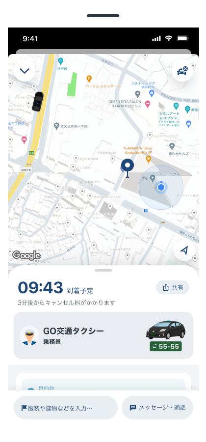 到着予定時間が表示されるので、待ち時間を有意義に使えます。乗務員と直接メッセージのやりとりもできるので万が一の場合も安心です。